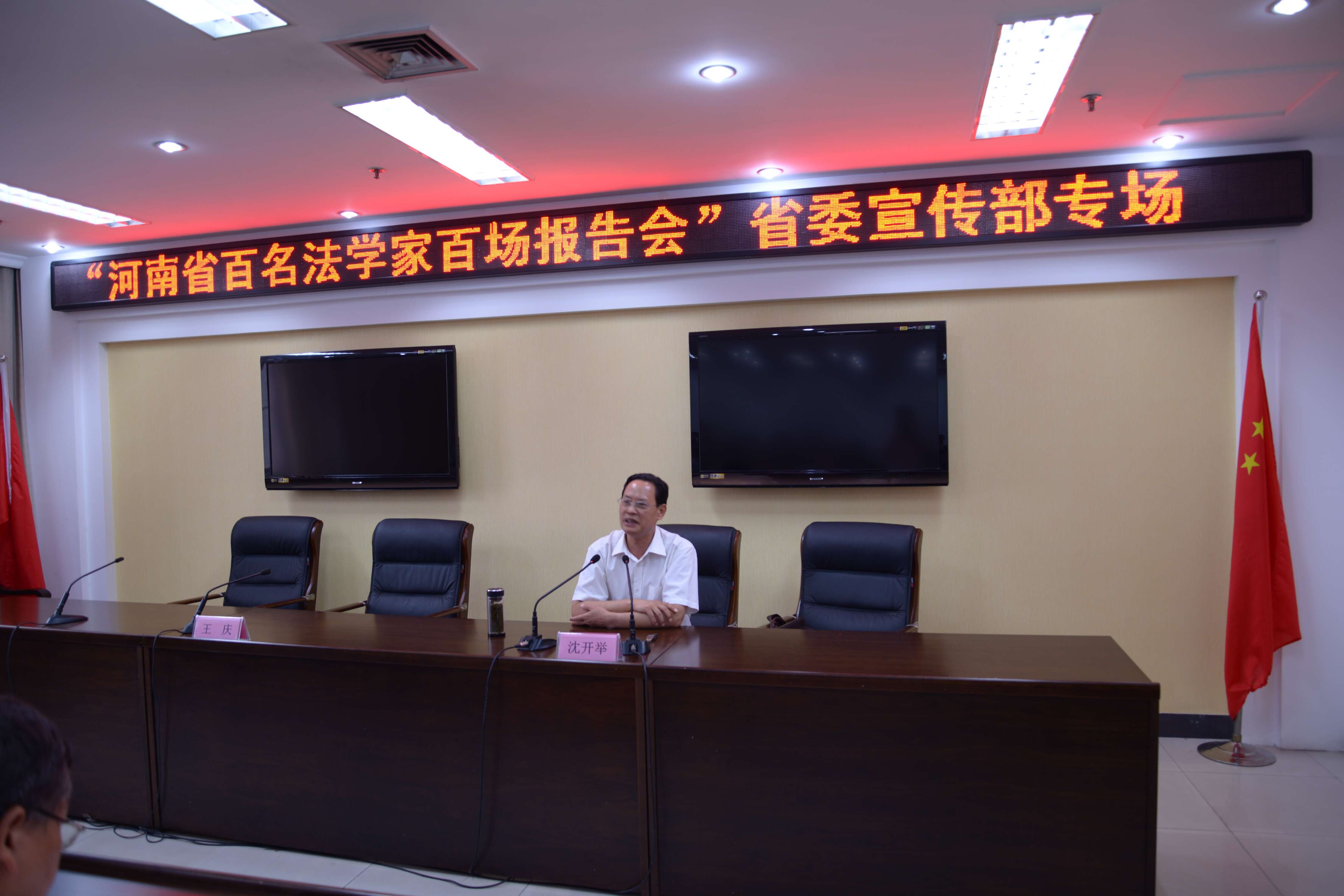 為更好地把握依法治國與加強黨的領(lǐng)導(dǎo)的關(guān)系,明確宣傳思想文化工作在推進(jìn)依法治國中的責(zé)任,根據(jù)省委組織部、宣傳部、政法委等聯(lián)合下發(fā)的《2015年河南省“百名法學(xué)家百場報告會”法治宣講活動實施方案》,省委宣傳部機(jī)關(guān)于2015年8月14日(周五)下午舉行了“河南省百名法學(xué)家百場報告會”省委宣傳部專場。